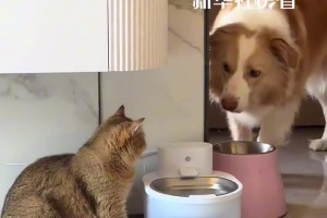 狗狗喝水时发现小猫害怕,主动退让耐心教导
