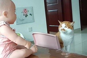小猫凑近宝宝,疑惑怎么有一股塑胶味道